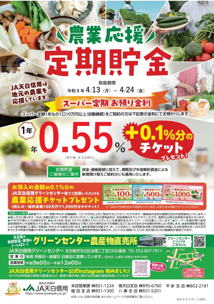 さらにお預入れ金額に応じてJA天白信用グリーンセンター等でご使用いただける農業応援チケットをプレゼント!
